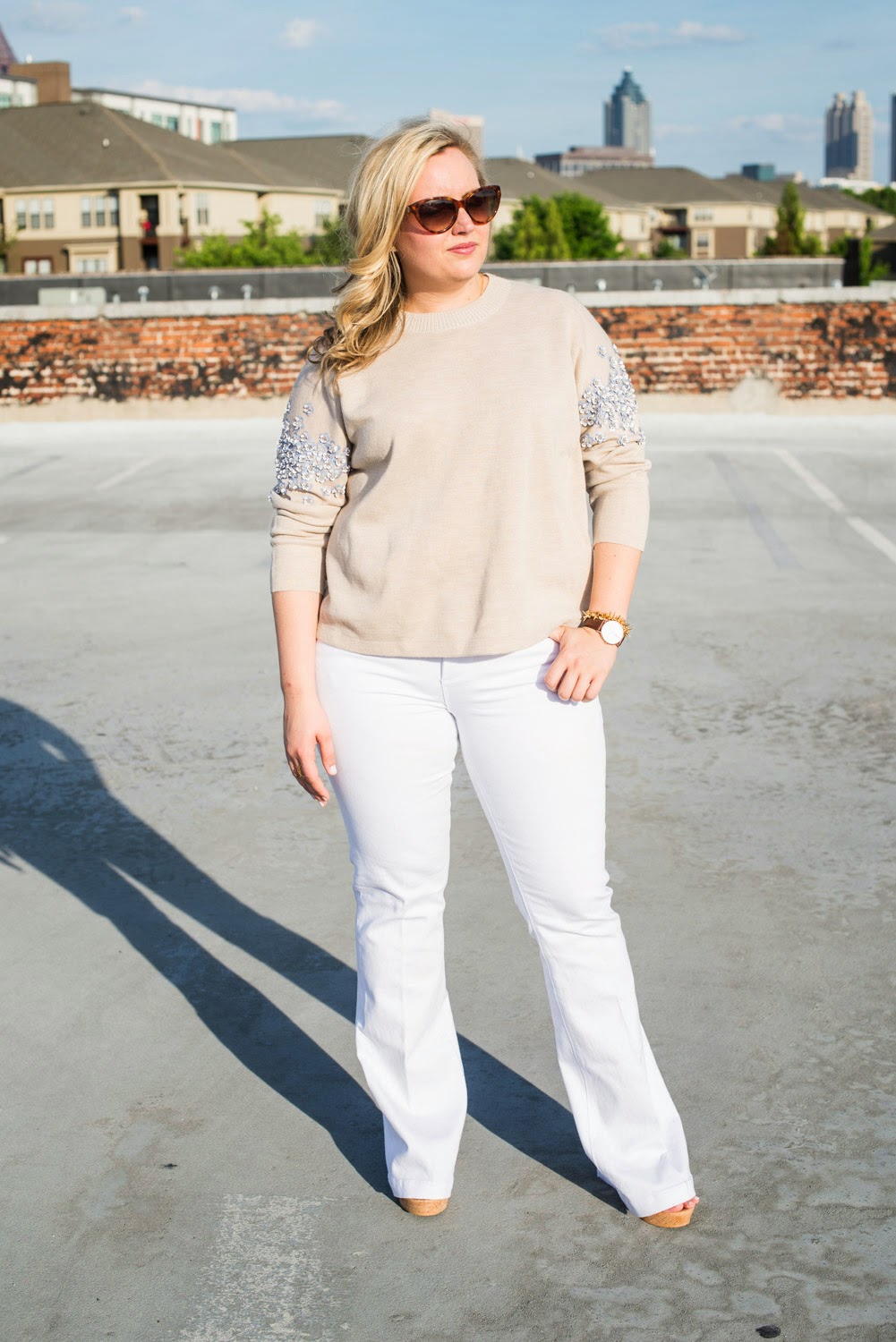 Moving on can we talk about how the flare is back and better than ever. I didn’t think I could ever pull this look off, but I am telling you these will be my go to jeans this summer. They make your legs look about a mile long and you don’t really have to worry about your shoes because no one can see them, or really should. That brings me to my next point, with a flare you should not be able to see your shoes, maybe just the smallest bit when you walk, but its totally appropriate to have your flare completely cover your shoe. So when your wondering what shoes to wear just go with a neutral wedge or heal.